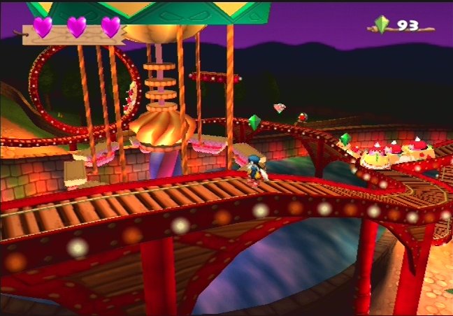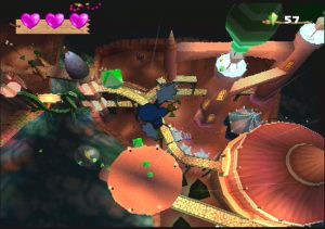 Klonoa’s PS2 outing introduces fully polygonal characters and gorgeous cel shaded graphics. The original game looked pretty decent on the PSOne, but some of the landscapes are incredible – Namco has crafted a world unlike any other, and Klonoa 2 is worth playing just to explore the scenery. Many of the locales are similar – wooded areas, caves, and so forth – but you also get to explore European style cities, carnivals and other beautiful locations. The PS2 also allows for even more dynamic camera effects – cannons will propel Klonoa through the sky, and the viewpoint tilts when Klonoa approaches a ledge, giving a sense of vertigo unheard of in most side scrollers. You’ll also find rockets that send Klonoa hurtling thousands of feet in the sky, giving a huge view of the whole level as you fall harmlessly back towards the earth. In respects to the 2.5D viewpoint, the original PlayStation version was a well executed experiment, while the sequel perfects it.