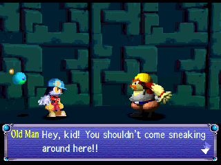 In the original PlayStation release, the characters are sprites, so they tend to pixellate rather nastily as the camera zooms in and out. These look especially awful in the cutscenes, but their subpar quality is completely overshadowed by the gorgeous polygonal backgrounds. The fact that the PlayStation can pull this off at such a consistently smooth frame rate – without all of the usual texture blockiness that 3D games suffer – is a testament of brilliance to Namco’s graphics programmers. Though most of the action takes place on a 2D plane, you’ll occasionally need to throw enemies into the background or foreground to hit switches or obtain other items. Most of the boss fights take place on a circular track, with the enemy in the middle. Like many classic Nintendo games, you can’t directly attack them, but instead need to find some way to use the smaller enemies on screen to toss back at them.