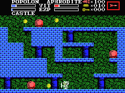 Other aspects remain the same. Each dungeon has the same suite of four optional helper items. Without a keyboard, the incantation mechanic is translated into button-sequence codes (e.g., A, A, A, B, B, B). Unfortunately, there are still a fair number of mostly-useless items, and super powerful items like the bat-erasing Dagger and time-stopping Bible are omitted. Popolon and Aphrodite have the same strengths and weaknesses as they did on the MSX; but in a cute twist, Popolon and Aphrodite now get discounts from shopkeepers of the opposite sex.