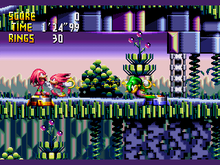 Despite the top billing the Western title gives him, Knuckles only gets about as much screentime as the rest of the new characters this particular game introduces. Mighty the Armadillo is an obvious stand-in for Sonic, to the point where his sprites are lightly edited from the hedgehog’s previous games. Vector the Crocodile is probably the most interesting of the lot, with a pair of headphones he’s constantly jamming with. Espio the Chameleon has a pretty fun ability that lets his feet stick to walls and ceilings, letting him run across them freely. Charmy the Bee is the smallest of the cast, but he can fly. Not just in the limited form Tails possesses, but specifically the ability to repeatedly dash in any direction as often as you want, with no limits placed upon it in the slightest. Unsurprisingly, this makes him the superior choice for getting through the game as quickly as possible.