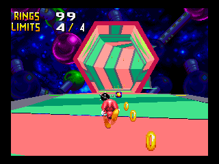 Probably the best new thing to come out of Chaotix is its polygonal bonus stage, which is where the game really makes the most of the 32X hardware. Your character navigates a tube-like 3D dimensional course where gravity is determined by the orientation of the surface they’re currently running on, with the objective being to grab enough blue spheres before the stage loops. While you can loop around as many times as you want before you hit the quota, the big constraint here is that your ring gauge is counting down every second, ending the stage when it hits zero. You can offset this by going in with a large ring count or grabbing some of the rings sprinkled around the stage, but there are naturally plenty of spike balls and saw blades to try and hasten your ring loss, springs and bumpers to waste time bouncing off, and gaps in and around the track that immediately end the stage if you fall into them.
