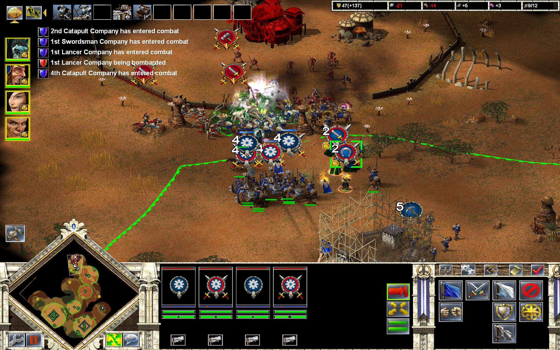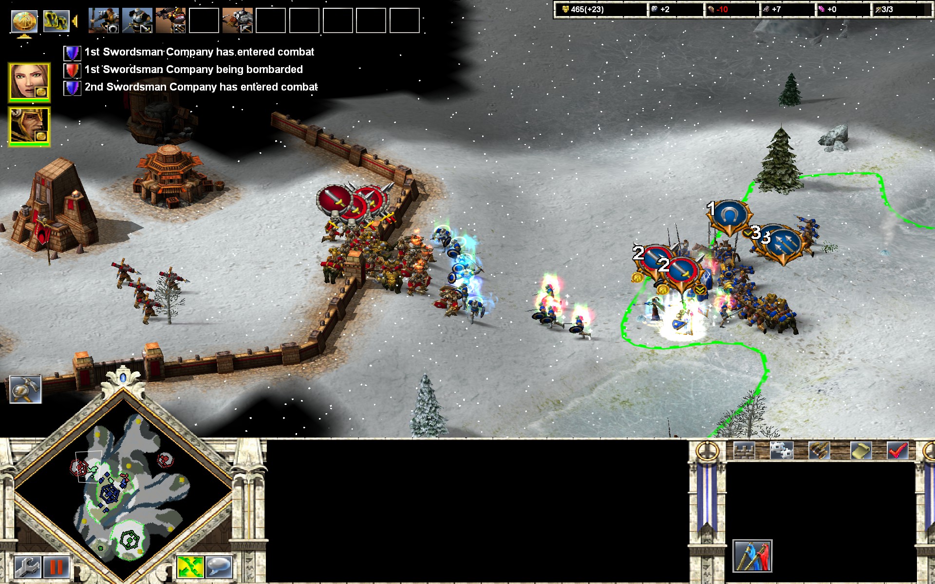 There’s a fine line between streamlining and simplification, and some features of the first generation are keenly missed in Kohan II. The freeform settlement system of Immortal Sovereigns and Ahriman’s Gift has given way to a “settlement point” system that dramatically reduces the number of cities on each map. Zones have been significantly overhauled. Units still heal in the Zone of Supply, but mines in the field no longer need to near a city or fortification to provide resources. Pathfinding is much better, but traffic jams are sadly common after a city’s walls are breached.
