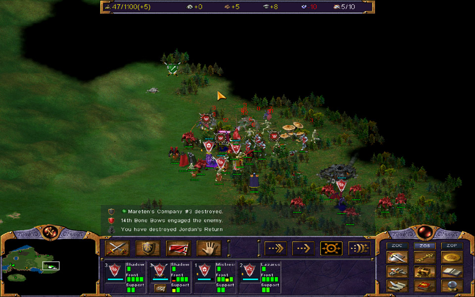 What’s especially brilliant about this system is that not only do companies move and fight as one, but they’re created as one. The makeup of a company is determined at the moment they’re built, and though Kohan can be slotted in and out in the field, the basic makeup of a company never changes. Heroes and support units provide both passive bonuses – to factors like defense, morale, sight range, and speed through difficult terrain – and many can cast spells as well as they can fight. Effective company designs can be saved for quick recall.