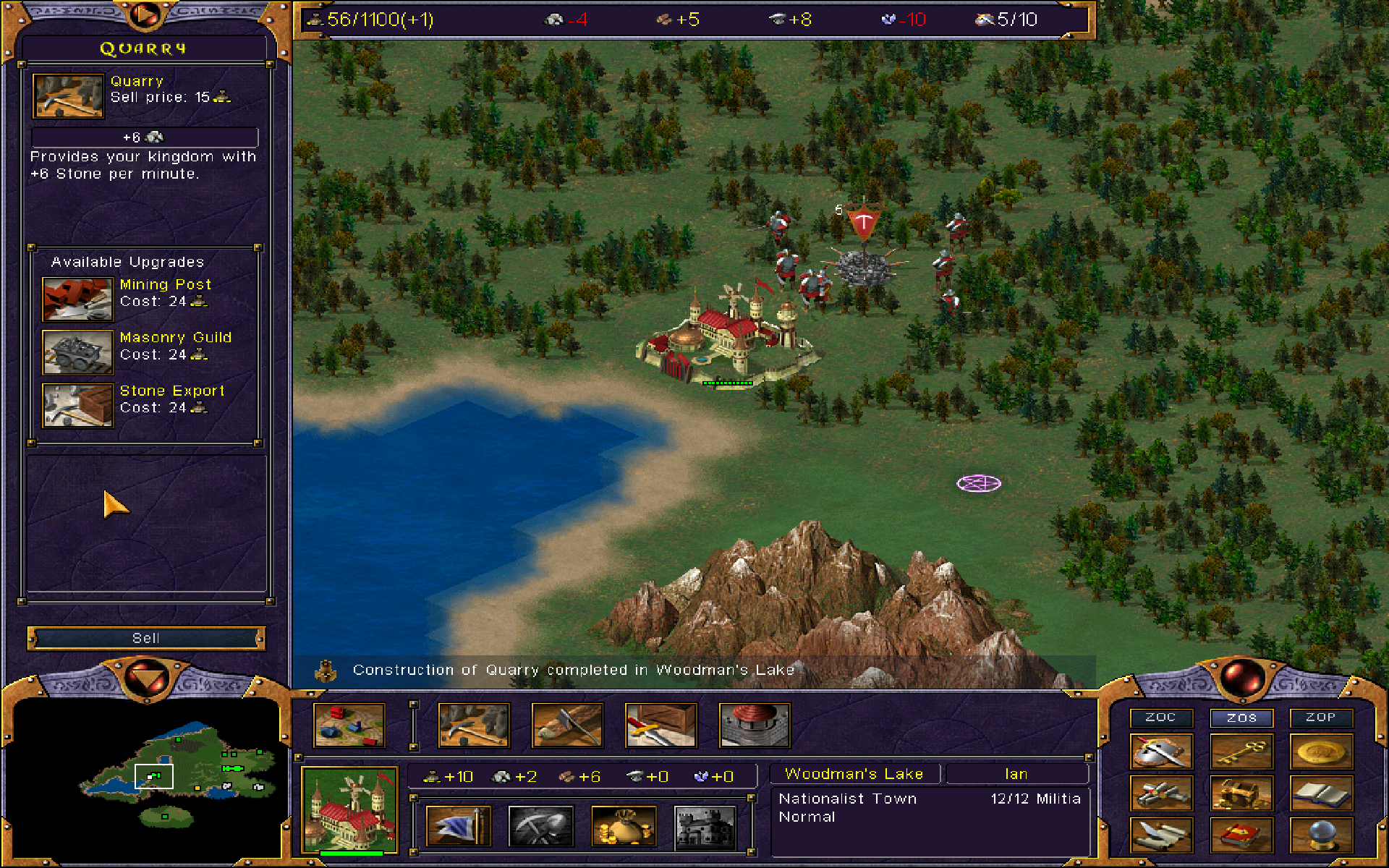With discrete companies, streamlined combat, and self-contained cities, Immortal Sovereigns is clearly dedicated to reducing the tedium of micromanagement – but the Kohan economic model puts the rest of its innovations to shame. On first glance, Immortal Sovereigns‘ economy looks even more complex than Age of Empires. With five resources in play – stone, wood, iron, mana, and gold – you would expect to see an intricate network of peasants and caravans hauling goods from countryside to city. But there’s nothing to see out there but varied and tactically relevant terrain, enemy and neutral cities, wandering monsters, treasure-filled lairs, and the odd resource-providing structure.