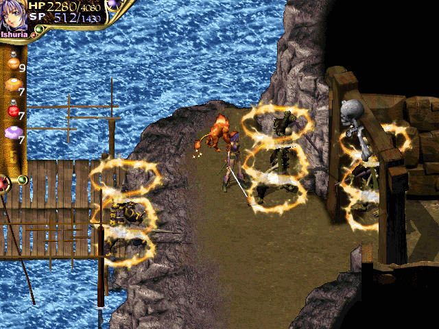 For the first time the prerendered graphics are rather good-looking, though they still appear sterile. The combat system has also been improved greatly and now stands nothing short of the greatest of beat 'em up-esque ARPGs like Terranigma or Story of Thor. Magic has never been a strength of the Corum series. Now some of the spells actually come in form of special moves that have to be executed during combos, making their usage much more natural.