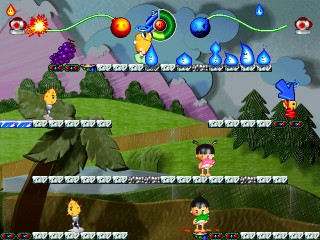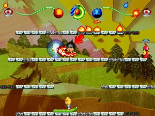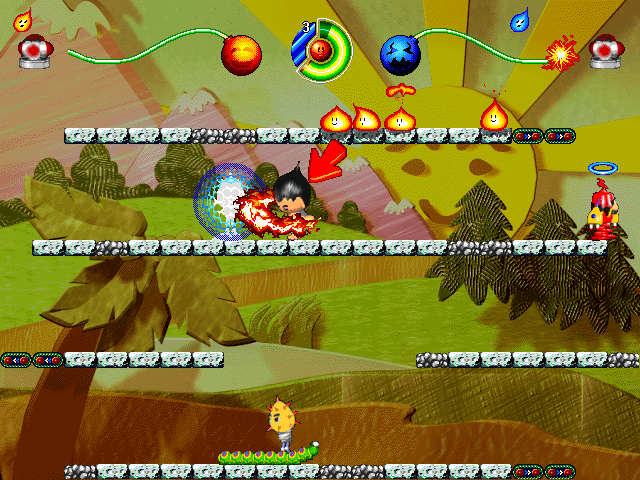 A simplistic arcade style single-screen action game. The players mainly fight against one or more designated enemy rivals (those with the halo), the other enemies are mere obstacles. Whoever hits the opponent is "on fire" and can set flames to the floor, while the other party's fuse is burning up. Whoever's bomb explodes first loses the round.