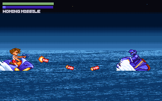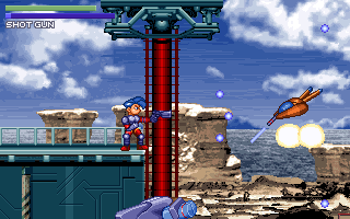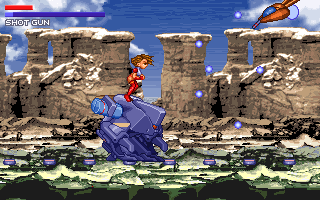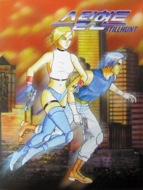 Possibly a transformed survivor of HiCom's otherwise fruitless Mega Drive phase, Still Hunt almost seems as if an ersatz for Gunstar Heroes, which was cancelled for a release in Korea because of censorship confusion. The design is breathing Treasure run 'n gun inspiration through and through. There's two playable characters (sadly no two player mode) with their individual extra weapons, half of which are lifted from Gunstar Heroes. Especially the flame thrower and the laser are very obvious, but some, like the napalm thrower, are completely new. In place of the innovative combining feature Treasure's masterpiece introcuded stands a simple experience-based upgrade system. Most of the time the two heroes will rely on their standard weapons, though, a shotgun and a machine gun.