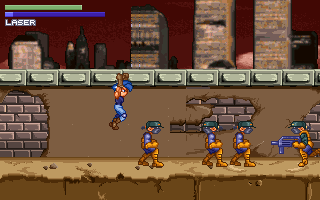 Still Hunt seems to have all the ingredients for a fun run 'n run, but it also has one big problem—level design. Most of the time, the task is just to run from left to right while mowing down a monotonous stream of enemies. The characters have dash attacks, the ability to hold onto ledges and even jetpacks, but all these are used only sporadically and often fail to enrichen the game in a meaningful way. Worst are the autoscrolling stages, some of which seem to go on forever. Only in the second half of the game there's some concept to the stages, but more often than not the AI can be cheated very easily, making even some bosses border on ridiculousness.