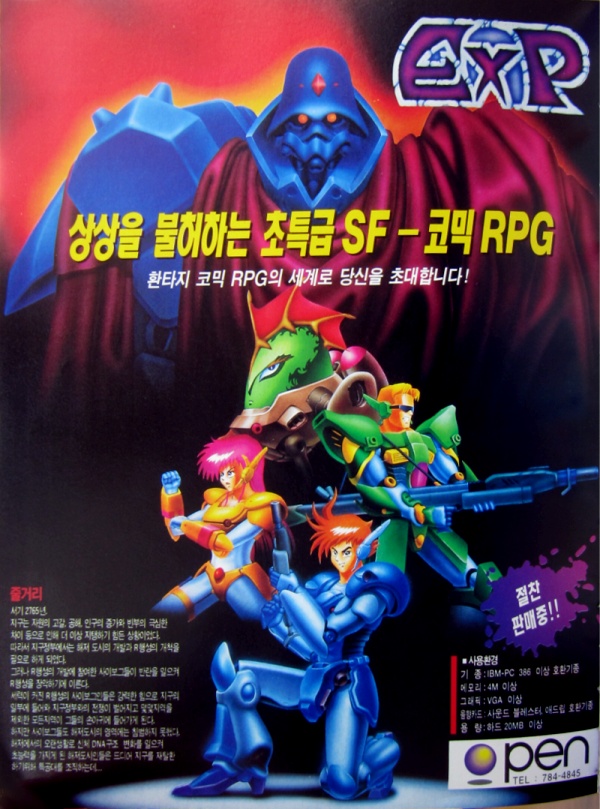 With veteran designer Lee Sanghun directing, Open tried their first RPG. EXP was originally conceived for the Mega Drive, but Open soon also announced a PC port, followed by the cancellation of the Mega Drive version.