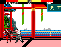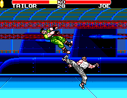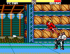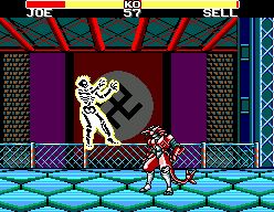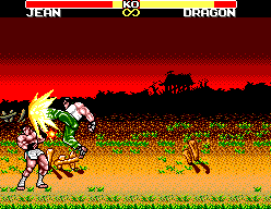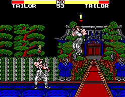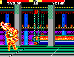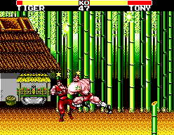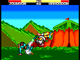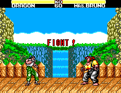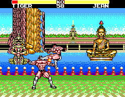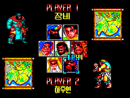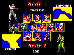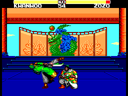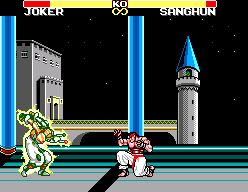The controls are astonishingly responsive for an 8-bit fighter, and while the characters' movelists are limited through the Master System's 2-button pad, every combatant has his or her selection of trademark special moves. The lack of grappling maneuvers is a bummer, though. Many characters are stock fighting game material, most interesting are the overweight couple Bruno and Mrs.Bruno, as well as the nazi cyborg. A few come from places usually not seen in a fighting game, like Budapest (Hungary) or Sarajevo (Bosnia and Herzegovina). Director and Programmer Lee Sanghun also kinda self-inserted himself with the Korean character Sanghun.