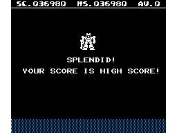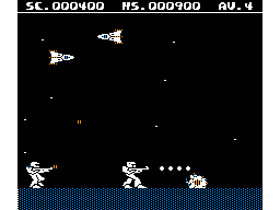 This port of a PC-6001 game originally published with PIO 2/1986 is quite an interesting shoot-'em-up/run 'n gun. Steering a robot that can fire in eight directions and even fly into the air, one has to eliminate all the enemies that come at it. It's also possible to walk around the otherwise empty planet surface, but often it is more save to wait for the enemies and concentrate on avoiding their bullets while firing back at the same time.