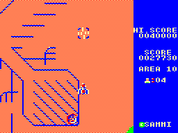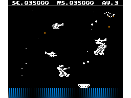 When no enemies are left in the stage, a boss appears that can be shot for bonus points. The alternative is to just run away, since the stage ends as soon as the player is far enough away from it. There are only three different stages, but after them the game grants an extra life and starts from the beginning with more aggressive enemies.