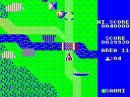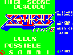 The port of the ever popular Xevious is based on Tiny Xevious mk II for the PC-6001, by Dempa. Because everything moves extremely choppy, it can be hard to spot the enemy bullets at all. After some getting used to it's not impossible, but it imposes a lot of stress on the eyes.