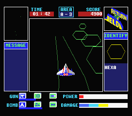 Like Olion, the shooter relies on 3D graphics, but they're more stilized and well-defined this time around. The actual gameplay takes place on two planes, though, with lasers to attack flying enemies and bombs for turrets and buildings on the ground. Both weapon systems have to cool down after excessive use, leaving the ship vulnerable to enemy attacks. But also time eats away on the life bar, so haste is mandatory. The player manages also the speed of the ship, which can even fly slowly backwards.
