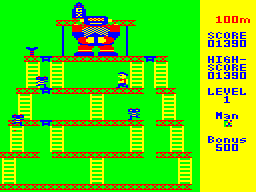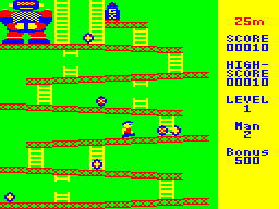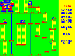 Now this PC-6001 port is looking familiar. Spy Panic takes Donkey Kong and replaces the ape with a robot who keeps hostage a bomb in place of a lady. Behind this makeup the result is actually more faithful to the original than many ports on comparable systems. All four stages are included, and the controls are very tight for an early 80's home computer game. Only the hammers are missing. The flames hunting "Mario" are replaced with mini robots, who are much more numerous and aggressive here, making this version very difficult.
