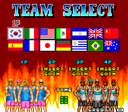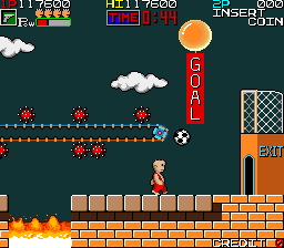 This arcade soccer game was SunA's first and only sports title. After selecting between 14 teams (whith visually well defined but strangely similar-looking team members), one or two players proceed to a match on the scrapyard. The game has a very arcade feel to it, with practically no rules, but several ball-on-fire special moves.