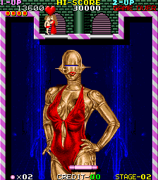 Other than the caveman in SunA's first game Goindol, the little guy at the top is just there for decoration. When a stage is completed, a woman in a dress comes out of the door and gives him a kiss. The game also uses renditions of famous paintings or statues for several of its backgrounds, once again including a couple Gynoids.