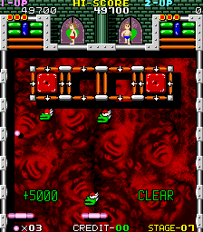 Goindol was one of the first arcade games developed in Korea, and at the same time the first one to get exported to the international market. A fast-paced Breakout clone, it incorporates many of the improvements first introduced by Arkanoid, like a gun powerup or indestructible blocks. It also contains a lot of elements one would rather expect to see on a Pinball table, like rubber bands, targets and holes.