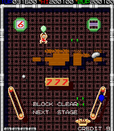 The player gets a constant adversary with the eponymous caveman (Goindol literally means dolmen in Korean and is often used to indicate anything neolithic. The Prehistoric video game series went by the same name in Korea). He walks around over the blocks and keeps throwing pieces of garbage at the player, that can't hurt him directly but serve as obstacles for the ball. There's a cure for that, though, by pulling the rug out from under him. As soon as he is in free fall, the ship gets equipped with a special gun to shoot away his loincloth. Yep, there's full frontal stone age nudity in this game. If the feat is completed, he won't bother the player again, at least not until the next one of hundred stages.
