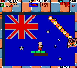 The game can be enjoyed by two players simultaneously, who can use each other's head as a springboard to reach higher places without relying on nearby enemies. Only in the second half the game tends to get a bit tedious, as there's almost no new elements introduced after the middle, and those from the early stages grow old fast because of their steady repetition. Less interesting is also the music, which is mostly snatched together from various classical pieces.