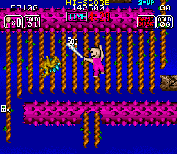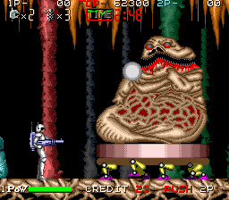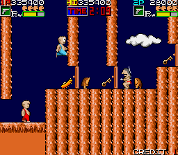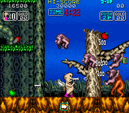 When one of the various grotesque enemies touches Hard Head, he gets stripped of his overalls, but other than Arthur in Ghouls 'n Ghosts, he doesn't even keep his undies and goes on running around completely naked. Seems SunA's got a thing for male nudity in their games. The function of the bubble gun has been completely changed. Enemies can't be enclosed in the bubbles anymore, instead it can be upgraded for various kinds of ammo. New are the club and morning star melee weapons, which are significantly more effective, but their upgrades wear off after a while. Hard Head can also find a pair of wings, that make him able to slowly float downwards when the jump button is mashed in mid-air.