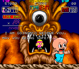 The story isn't very clear, but it seems the purpose of the whole adventure is to please a woman shown in "cutscenes" between each level, where she get's one more pet enemy each time. There's also an animation played of her kissing the hero when a heart item is collected during the stages, but the only effect seems to be a raised score.