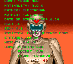 Spark Man is a side-scrollin run-'n-gun, whose protagonist seems to be loosely based on Wooroemae, a superhero from a 1980s series of live action / anime hybrid films5. The setting is a weird cold-war perspective cyberpunk world, where the hero is seen jumping on a horse on front of the Kremlin(?) in between missions.