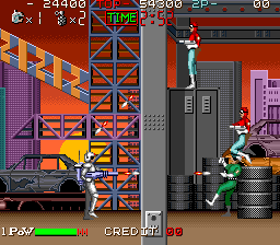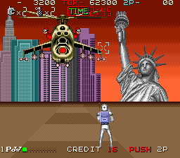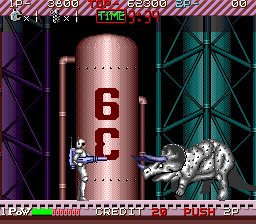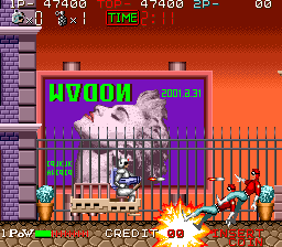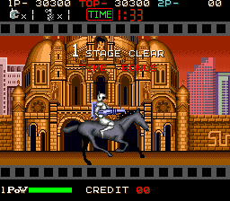 Rough Ranger was certainly SunA's worst act of stealing from other games. Not only is the gameplay almost identical to Namco's Rolling Thunder, its animations also were clearly used as a template for the graphics. It really almost is a re-skinned Rolling Thunder with new levels, the only real additions being simultaneous 2-player gameplay and a stage map showing the current progress in the game in between stages, while all extra weapons got cut, except an alternative amunition type for the standard pistol.