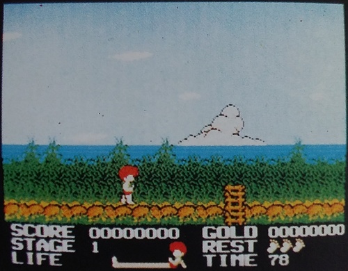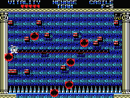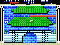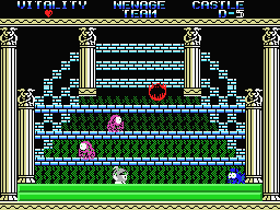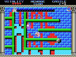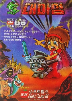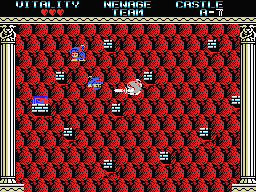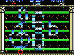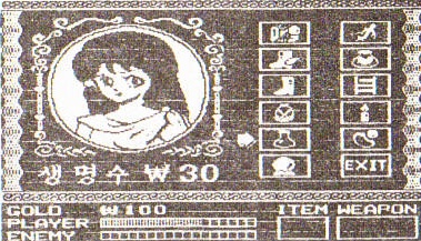 For the first time a Korean developed game couldn't be routed back to a single dominant inspiration, but elements of various action platformers, like Bubble Bobble and Knightmare II are combined into a unique mixture. The player leads a well-rounded (literally) knight through the many single-screen stages of a castle, to rescue the princess, who is featured on the cover but never seen on screen. In the beginning, he is only armed with a small sword, but in the halls of the castle are hidden better weapons, like a throwing lance and several magic spells. Like all other items, those are invisible at first and only reveal their position when a certain spot on the map is hit by a weapon. Until the knight wields ranged weapons, finding those spots can get quite aggravating. If players don't find the key to the boss' chambers among the nine rooms of every stage, they're sent back to the beginning of the current wing of the castle. Good for those who own a pair of spectacles and knows which room the key is to be found, as they reveal it instantly. Other items help the knight to survive multiple passes through the dungeon: A potion restores life points, a ring grants invincibility for a short time. Finally, there's an armor and a scuba suit, whose use doesn't really need any explanation.