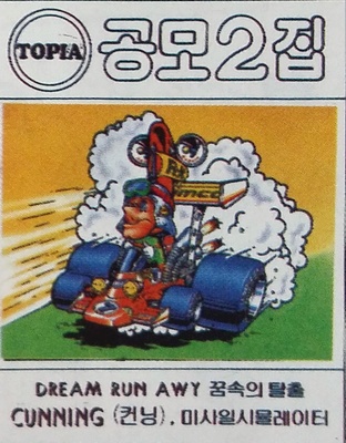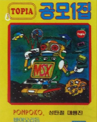 Topia's first known published Korean-made games were a series of compilations containing the winners' entries from a coding competition. There have been at least two volumes with three titles each. Not much is known about the first volume, but it contained programs named "Ponpoko" (obviously an adaption of the arcade game), "Seongtanjeol Daehaengjin" ("Big Christmas Parade") and "Bio Rhythm". The grand prize winner for volume 2 was Jang Changsu with the 3D racing game "Dream Runaway" ("Kkumsog-eui Talchul"), the other two runner-ups are titled "Cunning" (by An Jongseon) and "Missile Simulator" (by Park Taehyeon).