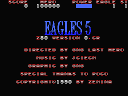 Around 1990 developers were getting the hang of MSX programming it seems, and some very solid games were created that year. Eagles 5 won't win any beauty contests, but it makes great use of the machine's capabilities. There's alway going on a lot on the screen, everything moves smoothly, and while there are occasional slowdowns and flickerings, both are kept to a minimum. There's also a ton of different enemy types, from mechanic to biologic to geometric ones. The unchanging space background with the planet in the middle gets a bit boring, though.