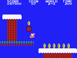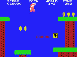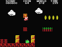 A lot of gameplay mechanics also don't work quite the same as in the original, whether it was because of the incapability of the MSX, the programmer or just the limited cartridge space. Elevators are no simple platforms that start falling down when stepped on, there are no Water levels, and all the little secrets that gave the game its charme to begin with, like warp zones, bonus levels and entering pipes aren't implemented at all. Powerup distribution is much more harsh, as the blocks that are supposed to hold them are subject to a random generator as well.