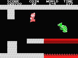 Zemina's take on Super Mario Bros. On the first four worlds of that game, to be precise. It seems the 32KB roms Zemina used had become to small for the full game (Super Mario Bros itself has only 6KB more, but the missing level data would have taken much less space as the graphics). But that's not the only thing amiss. Instead of being greeted in every castle by a mushroom with the legendary words 'Thank you Mario, but (...)', there's just an empty room with the statement "Sorry Nothing". The princess herself is missing as well.