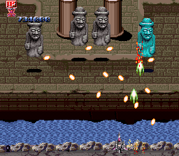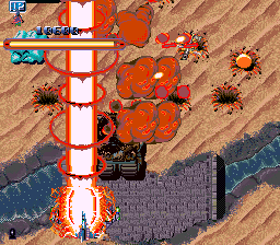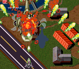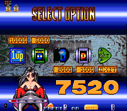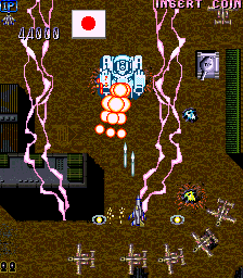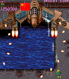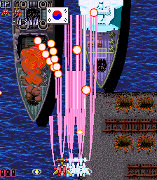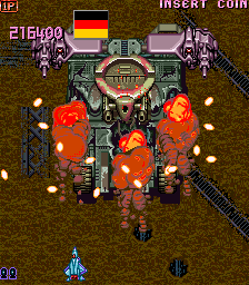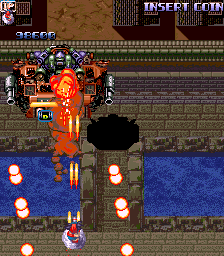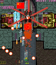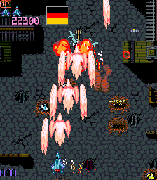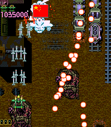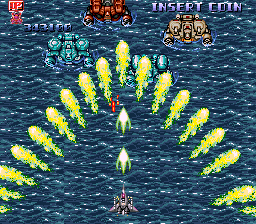 Powerup pickups during the stages have become much rarer now, more enemies now drop money instead, which can be used to buy upgrades in a store after each stage, but usually spending power is very limited, which is the major reason for this game being much harder than Red Hawk.