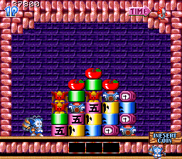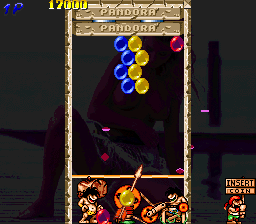 In the above-cited issue of Amuse World, Ryou Hainam mentioned another puzzle game called Pandora, which supposedly was rather successful in Europe. This seems to have been a revision of Puzzle World, which itself is a sequel to Dolmen, with the same character sprites from Prehistorik 2 or Puzzle Land. So far there's no trace of the 1996 Pandora itself, but there a later adult version called Hot Bubble, which still contains many instances of the Pandora logo.
