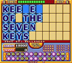 Alas, Afega's shooting dreams came to an end after Guardian Storm. Their next title was a vague adaption of The Wheel of Fortune. The game plays out pretty much like the show, only all solutions are song titles. There are only about 50 different in the game, and the artist is always displayed as an aid. Without that, the game would be practically impossible, as the rules are very harsh. A turn is over as soon as one guesses a wrong letter, and every round has no more than three turns. There's also a "Mania" mode, which actually is a lot easier, as the player gets to chose the artist for which to guess the song. Licensing here is very questionable. The game displays album covers in mania mode, but doesn't even play the music in question, instead it is content with the same bad tune all the time.