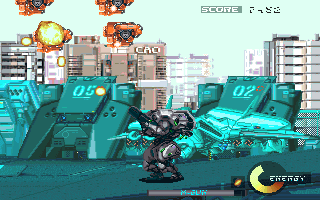 Although not a sequel per se, the game soon evokes memories of Interrupt, not only because the player once again takes place in a mecha. Instead of having to chose between two models, though, the machine in SAF unites the agility of the Ripple with the weapons and jetpacks of the Cyber-Troll and for good measure throws in the left & right fire buttons of the shmup sequences in Interrupt. Weapons can be upgraded in two levels, and filling the upgrade meter above that unleashes a devastating special attack particular to that weapon. During the first four stages weapons get gradually unlocked. After the initial machine gun follow a frame thrower, a grenade launcher and a laser cannon.