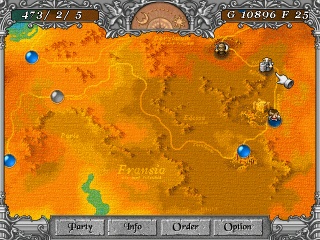 The band finds their contracts, new troops and a place to rest in the various towns scattered over the map, as well as stores to buy valuable potions and special weapons or sell loot from their victories. New squad leaders are hired here, who are useful in battle but devoid of any personality, never taking part in any dialogues. Other than in, say Fire Emblem, the leaders also never die, as they're not actually present on the battle screen. Troops to subordinate under the new leader are also hired here, with great differences in availability between locations. In the beginning, everything seems like a straight medieval setting, but more fantastic troops like dragons and griphons join in later in the game.