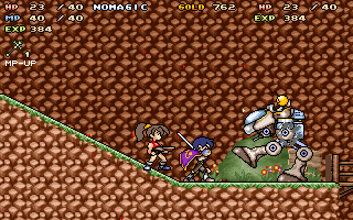 Although Lars the Wanderer is mostly a sidescrolling action platformer, there are a few RPG elements in the form of experience points (strategically banking on levelups is essential, as they completely heal Lars) and a variety of spells to learn. At the beginning of each section, Mimi asks if she should accompany Lars, whereupon she's controlled by a second player. She doesn't have any spells, but attacks enemies from afar with her mighty shotgun. The first half of the levels are strictly linear, only towards the end they become a little more labyrinthine. In between stages the wanderers visit towns where they can chat with villagers and buy supplies, similar to the Wonder Boy in Monster World games.