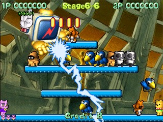 There's basically two ways to solve each level: Either collect all the gems and escape with them, or defeat all enemies. The latter is often easier said than done, as all enemy types take different strategies. The most basic ones can just be jumped on and then used as projectiles to take out even more with them. But soon the two cute magician protagonists encounter a new helmet-wearing breed, that can't be attacked directly, but have to be lured into Lode Runner type manholes the heroes can create with their wands. When enemies learn to jump over said holes or there are no diggable ground tile available, the only way to get rid of them, anymore, is picking up a potion of invincibility that makes it possible to attack enemies directly with the wand, or use up one of the rare hidden spellbooks that wipe out all enemies on screen.