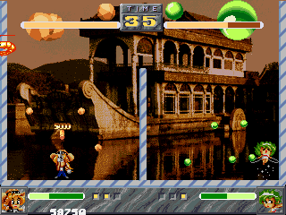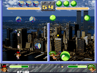 A Pang clone for two players. The goal is to deplete the opponent's energy by shooting the balls over to their side, while avoiding getting hit oneself. There are four characters to chose from, all bringing with them a unique spriteset for the balls.