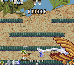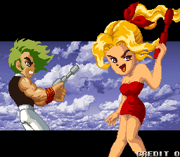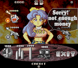 Once again one male and one female character are used as protagonists, but this time they have equal abilities and only differ in their looks. Instead of grabbing powerups directly, the two gather money by defeating enemies, which is used to buy weapons and ammunition in a shop between stages.