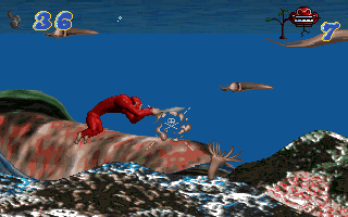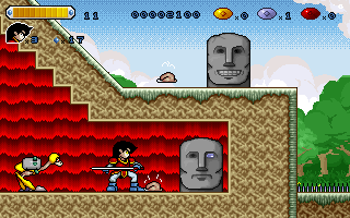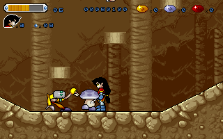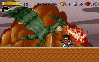 The prerendered graphics couldn't look any more hideous (except for the awesome rubber look of the firebreathing two-headed dinosaur boss), with the cutscenes in between stages, which show the protagonist doing all kinds of ridiculous anachronistic stuff, taking the cake. Like most platformers from Korea at the time, the game is also painfully short for a game released in 1996.
