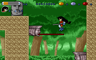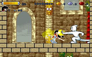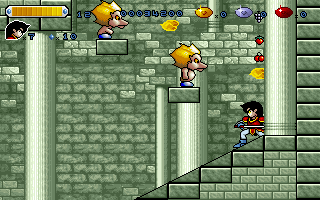 The gameplay isn't too shabby, either. Controls are tight and responsive with only occasionally aggravating collision detection. The stages are wide and give room for exploration, but not to a confusing degree. Level design is a bit on the bastardly side, though, not rarely hiding important platforms behind the foreground and with plenty of invisible passages. The game is never so mean as to drive players mad while searching for the three colored gems and the statues they have to be inserted to in order to open up the doors that lead to each stage's boss. Even stage 6, which is covered over its full size by an irritating foreground wall pattern, is surprisingly intuitive to conquer. And then it's already over.