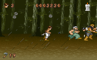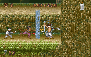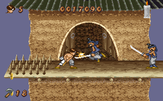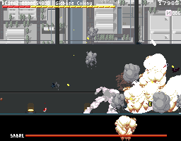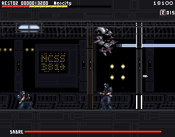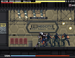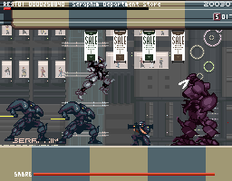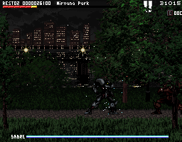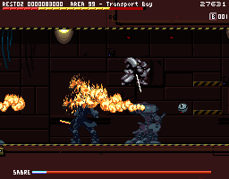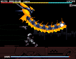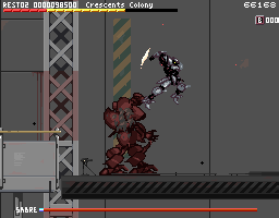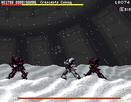 The level design is not too elaborate, but mean enemy placement and in result the required tactical approach prevent the game from ever getting boring. Crescents is very hard, but after the Game Over, one can always start on the same stage, so frustration is kept to a minimum. There is no saving function, however, so the nine stages have to be played in one sitting to see the ending. The mecha the player is in control of is mostly built for melee fighting, and there are various different attacks. Controls for those are easy to pull off, only the stab is a bit too easy, as it just requires pressing the attack button while walking in any direction. This results in many accidental stab attacks, and the animation keeps the mecha vulnerable for quite a long time when used in the wrong situation.