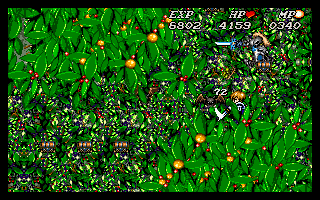 Similar to Protocoss, Astrocounter of Crescents was also one of the odd gems among Korean games, coming by unknown developers that didn't have much of a portfolio yet. This was all the more impressive as the developer Object Square Team consisted of only two people (although the music was outsourced to TeMP): Kim Donggun and Yi Eunseok, two students of the computer science program at KAIST1, who formerly were only known for the freeware Parodius homage 85 Doeeossuda. The extensive particle effects are a bit taxing on system speed, which can still be an issue when running it through a virtual machine nowadays. There is also a problem with DOSBox not supporting the programming tricks used fro the scrolling, which is supposed to be very smooth, but turns out really choppy in the emulator. But otherwise the visual impression is ace.