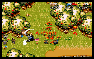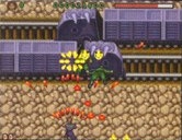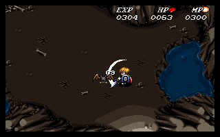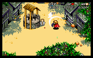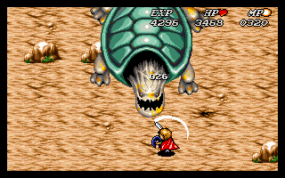 Grinding fortunately doesn't take much time, so after about an hour the little hero is ready to face the turtle. Not thanks to the enemies, though, which at that point only give 1-2 EXP upon defeat. Much more lucrative is plundering chests, which respawn each time an area is revisited, just as the enemies do, and contain healing items or EXP upgrades for up to 100 points. Even cutting grass brings faster results than beating enemies. Fighting gets also more annoying as the game processes, especially when it comes to monsters with ranged attacks. The hero is equipped with a bow and a boomerang as well, but their use is paid for in hit points, and the latter also has a ridiculously short range. Finally there's a spinning special attack, which is completely useless as it never hits the enemy.