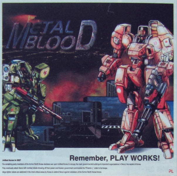 Just like Xionade by the same developer, Union Electron & Media's Metal Blood remained unpublished. Maybe part of the reason was the controversial setting: In the not-so-distant future of 2025 - intelligent robots have by now become a common sight - remainders of the former North Korean communist party and a secret "imperialist" Japanese organization starts a war of terror against a unified (since 2003, in the game world) Korea23.