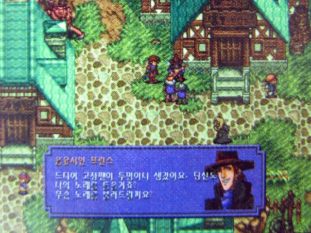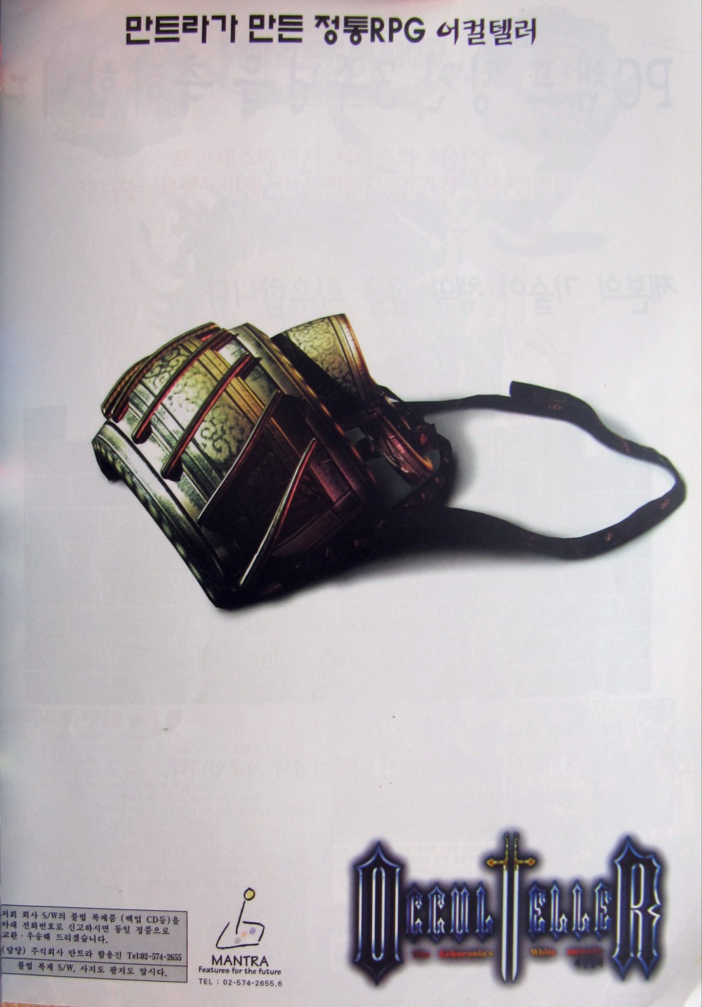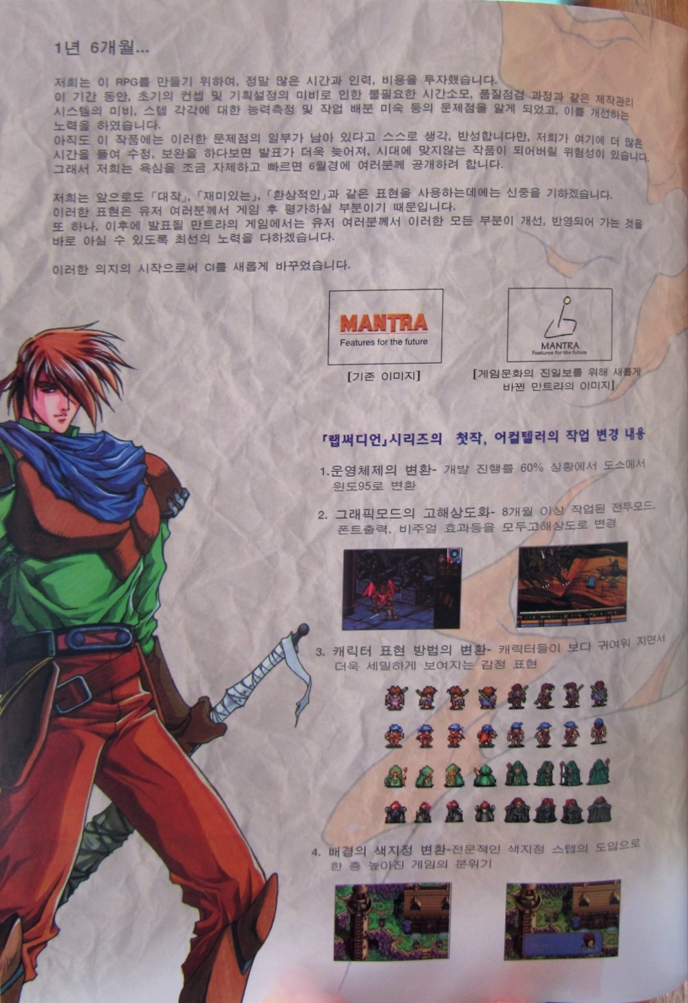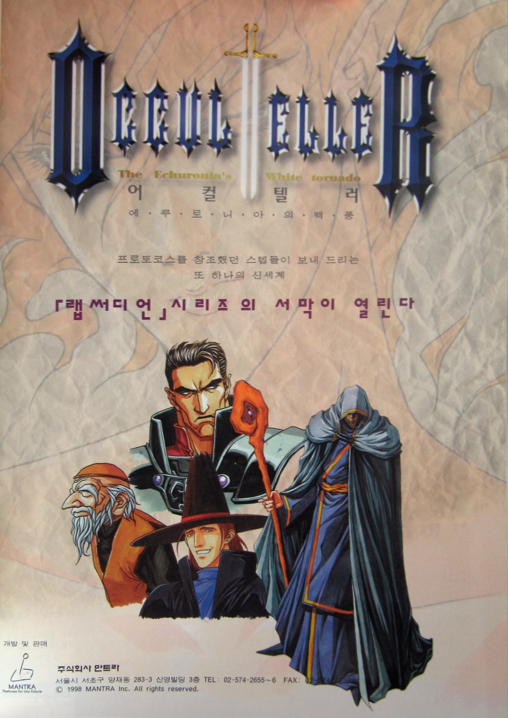 Occulteller should have become Mantra's magnum opus, their first game they developed from scratch as opposed to their usual localization work. It was first announced in early 1997, although development had purportedly begun in November 19963. (Most of the staff of the Ys II Special remake had left the company by then. Occulteller was made by members of the Protocoss team4.) In concept it was a series consisting of two games, but the chronological first episode, Yeonghon-ui Seom Atanda ("Atanda, Island of Souls"), was postponed rightaway in favor of the "side story," The Echuronia's White Tornado5.
