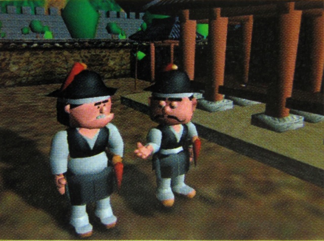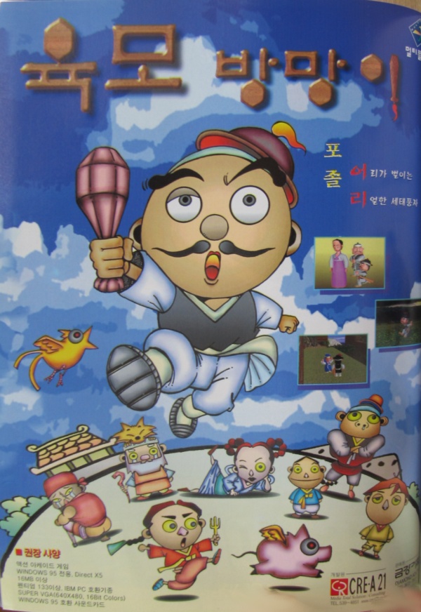 An action game by Crea-21, which has been likened to "Super Mario, but with a stronger focus objectives given in each stage instead of combat". The setting however, a goofy parody of traditional medieval society, makes it rather seem like the Korean answer to the Goemon series. The protagonist was the policeman Ugeoji that could talk to animals, but with no one believing him. In 8 interconnected stages, his quests would award him several traditional items, that he'd decorate his home with21. In later ads the game appeared as Yungmo Bangmangi ("The Hexagonal Club"), highlighting Ugeoji's new(?) weapon22.
